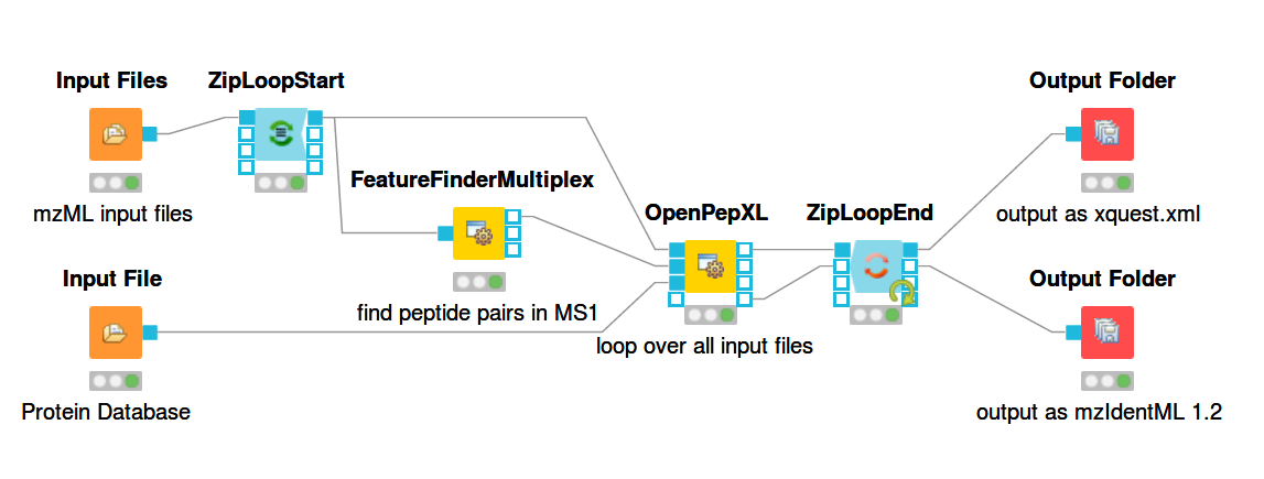 For reading in input files there are the nodes Input File and Input Files. Input File has one file path as its parameter and can be used for single files, like a protein database. The Input Files node takes a list of file paths for other nodes to iterate over. The ZipLoopStart and ZipLoopEnd nodes allow for a section of the workflow to iterate over multiple entries in a list. In this case FeatureFinderMultiplex and OpenPepXL or OpenPepXLLF are run multiple times, once for each input file defined in the Input Files node. The Output Folder nodes have a path to a directory as their parameter and write out all incoming data as files into that directory. The names of these files will be equal to the names of the mzML input files, but with a different file ending. The ZipLoopEnd node collects all the results of the loop before sending them further to the output nodes, so the results are written once after all processing is finished. Putting an Output Folder node inside the loop, e.g. right after OpenPepXL, will write out the results of the current input file right after OpenPepXL is finished with it. This type of workflow will go through the input files iteratively one by one and parallelization for each run can be set using the -threads parameter of OpenPepXL. To run a KNIME workflow, click on the green arrow button above the workflow pane.
