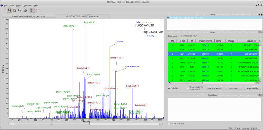 It will run OpenPepXLLF on all mzML input files, run the FDR estimation, filter by 5% FDR, remove decoys and write out idXML files for visualization in TOPPView (more below), as well as an CSV file containing all 1st ranked PSMs with FDR < 5% from all input mzML files. To run FeatureFinderMultiplex and OpenPepXL for labeled cross-link search, remove the OpenPepXLLF node and drag those two in. Connect the inputs and outputs in a similar way to the workflow above. You can also add a PeakPickerHiRes node for peak picking in front of FeatureFinderMultiplex or OpenPepXLLF if needed and adapt the filters as needed. The IDFilter node has a lot of options, but the only one used here is to filter by specific meta values of each ID (cross-link). The parameter -remove_peptide_hits_by_metavalue accepts three text strings that make up a condition. All IDs that fulfill this condition are accepted, others are filtered out. Look at the conditions set in the nodes of the workflow to get an idea about how this works. Most of the columns in the table returned by TextExporter can be used for filtering.